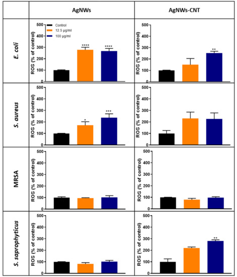 Previous studies suggested that oxidative stress plays a crucial role in the mechanism of toxicity of silver nanoparticles versus bacterial cells. In this work, extracellular ROS production was quantified 24 h after treatment with nanowires (Figure 5A–H). ROS were produced when S. aureus and E. coli were treated with all types of metallic nanoparticles in a dose-dependent manner, as previously reported for other types of AgNPs [27].