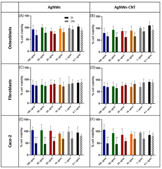 The toxicity of the two types of AgNWs was tested against three cell lines: osteoblasts (hFOB 1.19), human foreskin fibroblasts (Hs27) and Caco-2 cells (Figure 6A–F). These cell lines were chosen to mimic three possible routes of exposure such as the application of treatments to bone, skin and the digestive system, respectively [28]. No signs of acute toxicity were observed, as after 2 h of treatment, no cell line showed a significant decrease in cell viability (p > 0.05). After 24 h of exposure, fibroblasts were the more robust cells as their viability did not show a significant decrease with increasing doses of AgNWs and AgNWs-CNTs. Caco-2 cells were the most sensitive, with a significant decrease in viability at doses of 25 µg/mL of AgNWs (p < 0.001) and 10 µg/mL of AgNWs-CNTs (p < 0.001).