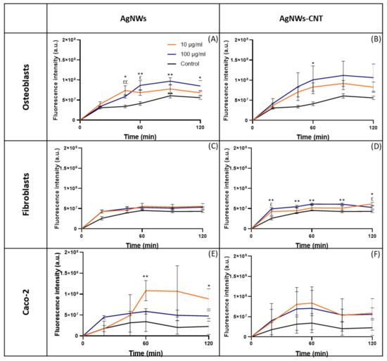 Time course of ROS production in different cell lines: osteoblasts (A,B), fibroblasts (C,D) and Caco-2 (E,F) treated with AgNWs or AgNWs-CNT for 15 min. One-way ANOVA returned p < 0.05. Data are reported as the mean ± SD (n = 3). Results of the post-hoc Tukey multicomparison test are shown in the graph: *was used to compare 100 with 0 µg/mL (* indicates p < 0.05 and ** indicates p < 0.01); $ was used to compare 10 with 0 µg/mL ($ indicates p < 0.05 and $$ indicates p < 0.01).