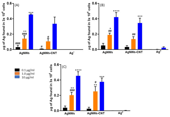 Uptake of silver by (A) osteoblasts, (B) fibroblasts and (C) Caco-2 treated with AgNWs, AgNWs-CNT and AgNO3. Data are expressed as the mean ± SD (n = 3). One way Anova indicated at least p < 0.05 for all samples tested apart from AgNO3. Results of the post-hoc Tukey multicomparison test are shown in the graph (symbol *compared to 0.1 and # compared to 10 µg/mL).