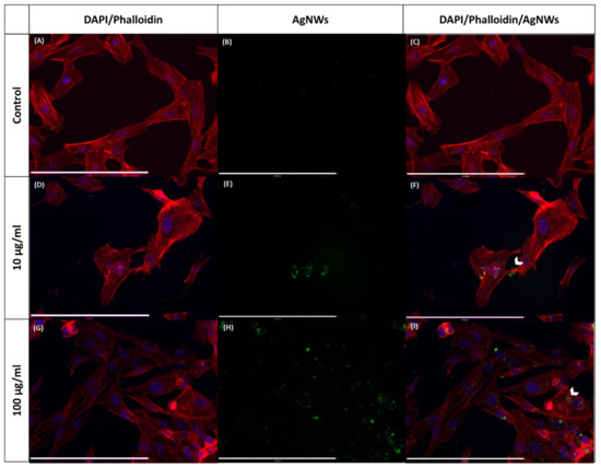 Phalloidin Dylight 550- and DAPI-stained osteoblast cells at 24 h of incubation with AgNWs (10 and 100 µg/mL). (A,D) and (G): merged images of Phalloidin (staining F-actin) and DAPI (staining nuclei) of osteoblasts. (B,E) and (H): AgNWs excited at 495 nm and emitting at 519 nm. (C,F) and (I): merged images of Phalloidin/DAPI/AgNWs. Scale bar 270 µm.