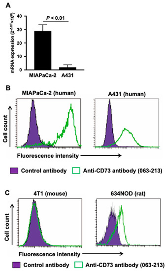 (A) CD73 mRNA expression analysis in MIAPaCa-2 and A431. (B) Flow cytometric analysis of anti-CD73 antibody 067-213 to two human cancer cell lines MIAPaCa-2 and A431. (C) Flow cytometric analysis of anti-CD73 antibody 067-213 to mouse and rat cell lines 4T1 and 634NOD. Green, anti-CD73 antibody; purple, control antibody.