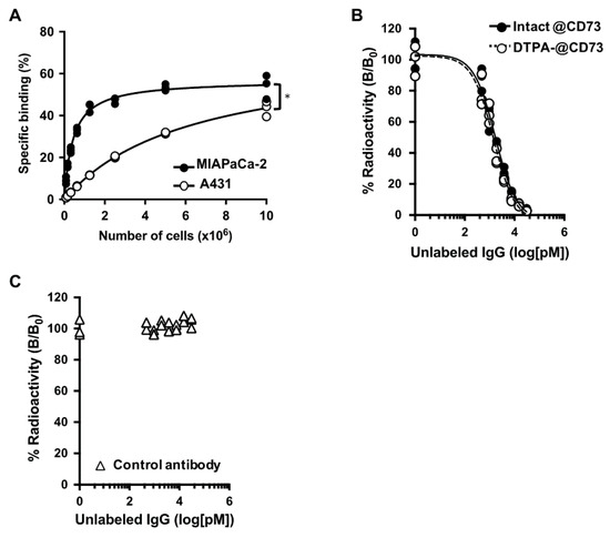 (A) Cell binding assay of 111In-labeled anti-CD73 antibody 067-213 with MIAPaCa-2 (CD73 high, black circles) and A431 (CD73 low, white circles) cells. * p < 0.05. (B) Competitive inhibition assay of 111In-labeled anti-CD73 antibody to MIAPaCa-2 cells with intact anti-CD73 antibody (black circles) and CHX-A″-DTPA-conjugated CD73 antibody (white circles) as a competitor. (C) Competitive inhibition assay of 111In-labeled anti-CD73 antibody to MIAPaCa-2 cells with control antibody as the competitor.