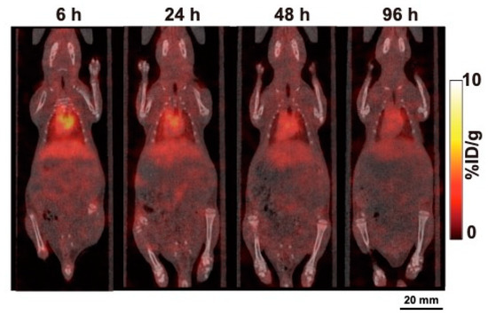 Representative SPECT/CT images of 111In-labeled 067-213 at 6, 24, 48, and 96 h after injection are shown in Figure 4. Imaging showed marked accumulation of 111In-labeled 067-213 in the heart and liver at 6 h, with the presence of the probe in these organs decreasing with time. No marked accumulation of the probe in the other organs was observed in the SPECT/CT images.