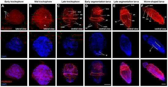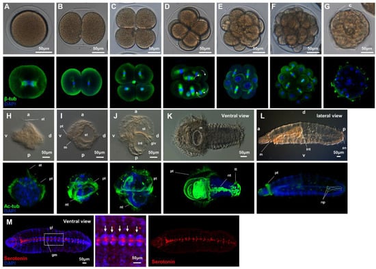 The specimens were investigated at the cleavage stage (beta-tubulin antibody with DAPI), trochophore stage, segmentation larval stage (acetylated-tubulin, Sigma-Aldrich, Saint Louis, MO, USA with DAPI Sigma-Aldrich, Saint Louis, MO, USA and Texas Red™-X phalloidin staining, Invitrogen, Waltham, MA, USA), and worm-shaped larval stage (acetylated tubulin and serotonin antibody with DAPI and Texas Red™-X phalloidin staining).