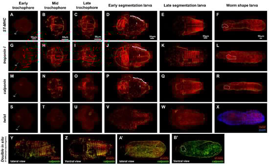 Uun_st-mhc, Uun_troponin I, Uun_calponin, and twist were expressed in a mesoblast cell and the blastpore region at the early trochophore stage (Figure 3A,G,M,S).