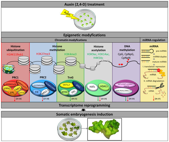 An overview of the epigenetic processes, including chromatin modifications and miRNA-mediated gene regulation that control auxin-induced embryogenic response of explant cells. Modifications of chromatin, including histone methylation, acetylation, and ubiquitination together with DNA methylation, control the transcriptome of explant cells in response to auxin treatment. The epigenetic complexes controlling the SE-transcriptome involve both the repressors (PRC1, PRC2, HDACs, DRM1-2, MET1, CMT1-3, and DNMT2) and activators (TrxG, HATs, DME, ROS1, and DML2-3) of gene expression. The specific epigenetic marks that activate and repress gene transcription are indicated in green and red, respectively. Arrows and circle-shaped ends show the activation or repression of gene expression, respectively [14,15,16,17,18,19,20,21,22,23,24,25,26,27]. (2,4-D) 2,4-dichlorophenoxyacetic acid; (AL) ALFIN-LIKE; (AtBMI1a/b/c) B LYMPHOMA Mo-MLV INSERTION REGION 1 HOMOLOGa/b/c; (AtRING1a/b) RING FINGER PROTEIN1a/b; (ATRX7) Arabidopsis TRITHORAX-RELATED7; (ATX1) ARABIDOPSIS HOMOLOG OF TRITHORAX1; (CLF) CURLY LEAF; (CMT1-3) CHROMOMETHYLASE1-3; (DME) DEMETER; (DML2,3) DEMETER-LIKE PROTEIN2,3; (DNMT2) DNA NUCLEOTIDE METHYLTRANSFERASE2; (DRM1,2) DOMAINS REARRANGED METHYLTRANSFERASE1,2; (EMF1,2) EMBRYONIC FLOWER1,2; (FIE) FERTILIZATION-INDEPENDENT ENDOSPERM; (FIS) FERTILIZATION INDEPENDENT SEED; (HATs) HISTONE ACETYLTRANSFERASEs; (HDACs) HISTONE DEACETYLASEs; (LHP) LIKE HETEROCHROMATIN PROTEIN; (MEA) MEDEA; (MET1) METHYLTRANSFERASE1; (miRNA) microRNA; (MSI1-5) MULTICOPY SUPPRESSOR OF IRA1-5; (PKL) PICKLE; (PRC1,2) POLYCOMB REPRESSIVE COMPLEX1,2; (ROS1) REPRESSOR OF SILENCING1; (SWN) SWINGER; (TrxG) Trithorax-group; (ULT1,2) ULTRAPETALA1,2; (VAL) VP1/ABI3-LIKE1-3; (VRN1,2) VERNALIZATION1,2.