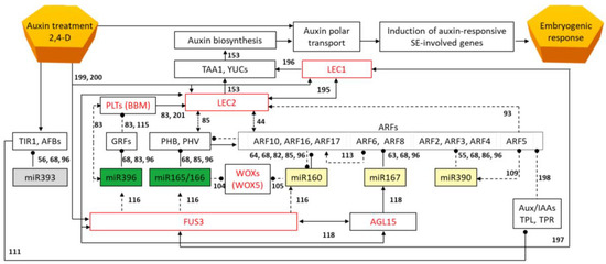 Little is known about the regulators of the SE-associated auxin-related miRNAs and among the candidates is FUSCA3 (FUS3), which is structurally and functionally related to LEC2, and was suggested to control the MIR156, MIR160, MIR166, and MIR396 genes in an embryogenic culture of Arabidopsis [116]. In addition, another key regulator of the embryogenic transition, the AGAMOUS LIKE15 (AGL15) TF, which interacts with LEC2 and FUS3 in the auxin-mediated pathway of SE induction (reviewed in [117]) has been postulated to control auxin signaling in both Arabidopsis and soybean via the direct stimulation of a miR167a-encoding gene [118].
