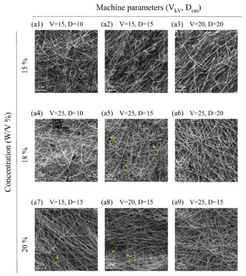 (a1–a9) SEM images showing the morphology of as-spun polycaprolactone (PCL) fibrous mats obtained from solutions at different concentrations and various machine parameters (V and D) (arrows show some beads have formed in microstructures).