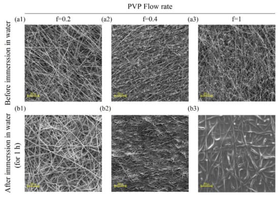 However, a balance should be maintained between the preservation of structural integrity and the decreasing of microstructural density. Therefore, a flow rate of 0.4 mL/h was selected for the next stage. It seems that beads, as shown in Figure 2a1–a3, are related to PVP fibers, as they disappeared partially after immersion in water as it displayed in Figure 2b1–b3. However, there has not been sufficient time for them to be completely dissolved. As depicted in Figure 3, the increasing of the immersion time to 24 h at the next step led to complete dissolving of PVP fibers (Figure 3b,3b1) with significant increase in the average pore diameter of samples (from 4.46 μm before immersion to 33.55 μm after immersion in water, Figure 3c).