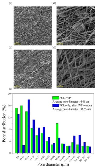 SEM images of PCL fibrous mats after the soaking of simultaneous electrospun PCL/PVP samples in water for 24 h: (a,a1) before immersion; (b,b1) after immersion; (c) comparative histograms for pore diameter distribution before (PCL-PVP)and after (PCL) immersion in water.