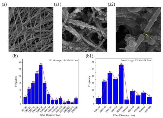 (a) SEM morphology of pristine PCL (control); (a1,a2) SEM morphology of aminolized PCL electrospun mats grafted with collagen/chitosan blend under different magnifications (arrow shows a typical uncoated part); (b,b1) comparative histograms of fiber diameter before (b) and after (b1) coating.
