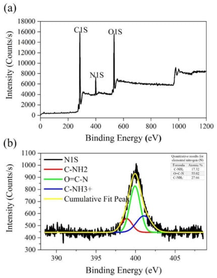 The results of X-ray photoelectron spectroscopy (XPS) spectra analysis: (a) Collagen/chitosan-grafted PCL membranes; (b) detailed and quantitative analysis of elemental nitrogen (N1s).