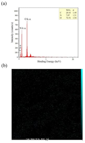 Figure 6b depicts a uniform distribution of nitrogen gained from 2D elemental mapping of nitrogen (N) using EDXS analysis and related peaks (Figure 6a), which reaffirms the success of the coating process. These findings suggest that the coating process has been carried out successfully.