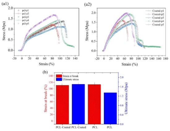 (a1,a2) Stress–strain curves of (a1) pristine PCL membranes and (a2) collagen/chitosan-coated specimens; (b) Comparative histograms of ultimate stress and strain for pristine PCL (PCL-p1 to p5) and coated specimens (coated: p1–p5) (The comparison of data between the two groups (n = 5) using one-way ANOVA did not show any significant difference for p < 0.05.).