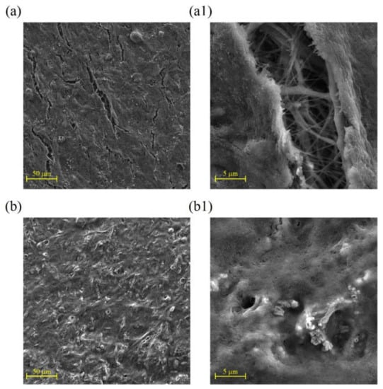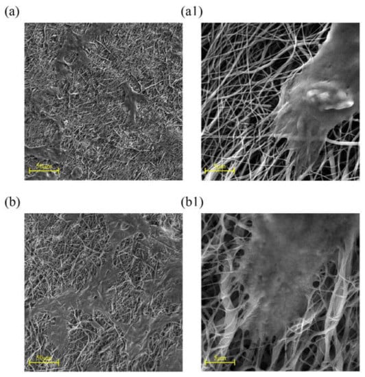 SEM images showing HaCaT cell line adhesion on (a,a1) pristine PCL electrospun samples; (b,b1) collagen/chitosan grafted specimens (cultured for 3 days).