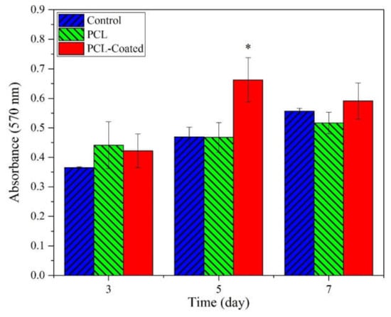 Evaluating the viability of HDF cells on samples using MTT assay at different times (3, 5, 7 days) for pristine PCL fibrous mats and collagen/chitosan coated samples. Medium without scaffold was considered as the control. (One-way ANOVA analysis indicated a statistically significant difference between coated and uncoated specimens at day 5, * p < 0.05, n = 3.)