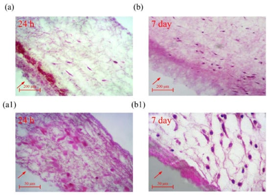 Evaluation of cell ingress into PCL fibrous mats using HDF cells: (a,a1) after 24 h; (b,b1) after 7 days (after simultaneous electrospinning of PVP and PCL, PVP fibers were removed to increase the porosity of electrospun samples).