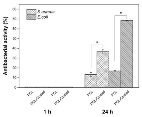 Histograms of antibacterial assay against two bacterium strains for pristine PCL and coated scaffolds after 1 h and 24 h. (One-way ANOVA analysis indicated a statistically significant difference between the antibacterial activity of coated samples in comparison with uncoated ones after 24 h, * p < 0.05, n = 3.)