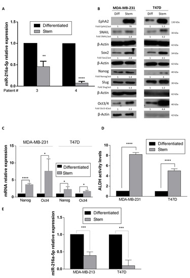 MiR-216a-5p expression in breast cancer stem cells (BCSCs). (A) MiR-216a expression levels were analyzed by qRT-PCR in primary breast cancer cells cultured in suspension (stem cells) or adherent (differentiated cells) conditions. (B) MDA-MB-231 and T47D stem cells express higher levels of stem markers compared to differentiated cells, as assessed by Western blotting. (C) MDA-MB-231 and T47D stem cells express high levels of Oct4 and Nanog, as assessed by Real-time PCR. (D) MDA-MB-231 and T47D stem cells have high levels of ALDH activity, as assessed by flow cytometry. (E) MiR-216a is down-regulated in enriched stem cell cultures. Data are mean values ± SD of three independent experiments. Significance was calculated using Student’s t-test. *, p < 0.05, **, p < 0.01, ***, p < 0.001, ****, p < 0.0001.