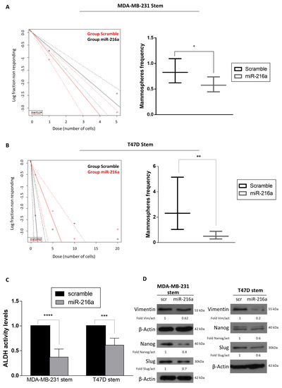 MiR-216a-5p regulates BCSC phenotype. (A,B) MiR-216a overexpression decreases the frequency of stem cells in MDA-MB-231 and T47D cultures, as assessed by limiting dilution assay. Significance was calculated using ELDA software. (C) ALDH activity decreases after transfection with miR-216a in MDA-MB-231 and T47D stem cells. (D) Stemness and EMT markers are decreased after transfection of miR-216, as assessed by Western blotting, in MDA-MB-231 and T47D stem cells. Data are mean values ± SD of three independent experiments. Significance was calculated using Student’s t-test. *, p ≤ 0.05; **, p < 0.01, ***, p < 0.001, ****, p < 0.0001.
