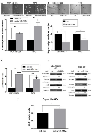In an effort to elucidate the role of miR-216a on stemness properties, we modulated miR-216 levels in stem cells and then performed a limiting dilution assay. The frequency of MDA-MB-231 and T47D stem cells in a mixed population decreased upon miR-216a overexpression (Figure 2A,B). Interestingly, miR-216a overexpression induced a decrease in ALDH activity in both MDA-MB-231 and T47D stem cells (Figure 2C, Supplementary Figure S1A). Additionally, overexpression of miR-216a decreased the expression of stemness markers (Nanog and Slug) and Epithelial Mesenchymal Transition (EMT) markers (Vimentin) in stem cells, as analyzed by Western blotting (Figure 2D). Conversely, downregulation of miR-216a in differentiated cells enhanced the capability of differentiated breast cells to form mammospheres, while overexpression decreased the propensity to become stem cells, as assessed by a mammosphere assay (Figure 3A,B, Supplementary Figure S1B). Moreover, down-regulation of miR-216a in differentiated T47D and MDA-MB-231 cells induced upregulation of ALDH activity (Figure 3C) and stem and EMT markers (Figure 3D). Moreover, to further confirm the role of miR-216a on stemness properties, we took advantage of an organoid culture system as a model closer to an in vivo experiment. For this, we transfected anti-miR-216 in breast cancer patient-derived organoids. Interestingly, we observed an increased ALDH activity (Figure 3E). Therefore, miR-216a negatively regulates stemness properties.