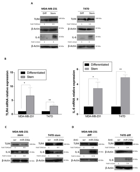 Toll-like receptor 4 (TLR4) is targeted by miR-216a-5p and regulates interleukin 6 (IL-6) levels. (A,B) TLR4 and IL6 protein and mRNA levels are higher in MDA-MB-231 and T47D stem cells compared to differentiated cells, as assessed by Western blotting and qRT-PCR, respectively. (C) MiR-216a overexpression induces a decrease in TLR4 and IL6 protein expression in MDA-MB-231 and T47D stem cells. (D) Conversely, by downregulating miR-216a, TLR4 and IL6 protein expression are increased. Significance was calculated using Student’s t-test. *, p < 0.05; **, p < 0.01. In (C) the blots representing TLR4 and IL-6 for MDA-MB-231 and T47D are from the same gel of Figure 2D. In (D) the blots representing TLR4 and IL-6 for MDA-MB-231 and TLR4 for T47D are from the same gel of Figure 3D.