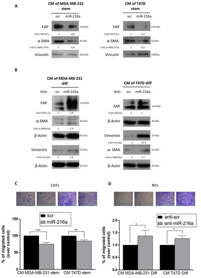 We next evaluated if downregulation of miR-216a in BCSCs induced fibroblast activation into CAFs. We treated CAFs with conditioned media collected from MDA-MB-231 and T47D stem cells transfected with miR-216a. After 48 h, cells were harvested and the expression of CAF activation markers (FAP and α-SMA) evaluated by Western blotting. We found that miR-216a-conditioned media reduced CAF activation compared to the control (Figure 5A). Conversely, the conditioned media from differentiated MDA-MB-231 and T47D cells upon downregulation of miR-216a induced education of NFs into CAFs (Figure 5B). In addition, CAFs treated with conditioned media collected from MDA-MB-231 and T47D stem cells transfected with miR-216a decrease their migration (Figure 5C), while conditioned media from differentiated MDA-MB-231 and T47D transfected with anti-miR-216a increased the migratory ability of normal fibroblasts (Figure 5D). Thus, in BCSCs, miR-216a decreases release of soluble factors that induce CAF activation, regulating the stem cell–microenvironment network.