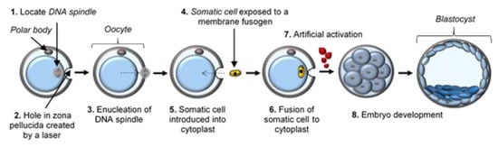 Somatic cell nuclear transfer (SCNT) has been an area of interest in the field of stem cell research and regenerative medicine for the past 20 years. The first step in SCNT is called enucleation and can be described as the removal of the haploid (1n) chromosomes comprised of the meiotic spindle complex from a metaphase II (MII) stage oocyte [,]. Enucleation is then followed by the transfer and fusion of a diploid (2n) somatic cell (obtained from a suitable donor) into an enucleated oocyte, the latter of which is known as a cytoplast [,]. The manipulated oocyte is then artificially activated by means of either electric pulses or chemical stimulation, which induces subsequent development of the embryo [] (Figure 1). Somatic cell nuclear transfer is used primarily for generating cells and tissues that are immunocompatible with the somatic cell donor, a concept known as therapeutic cloning. Originally suggested in 1999, the production of patient-specific or genetically identical embryonic stem cells (ESCs) for research and therapeutic purposes emphasizes the potential of SCNT as a technique with unique applications [].