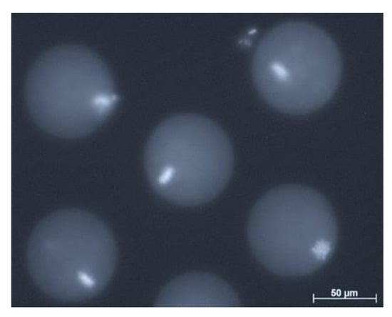 Fluorescent microscopy image of Hoechst 33342 DNA stained B6D2F1 mouse oocytes (image captured by C.G. as part of her Masters dissertation at the Reproductive Biology Laboratory, University of Pretoria).