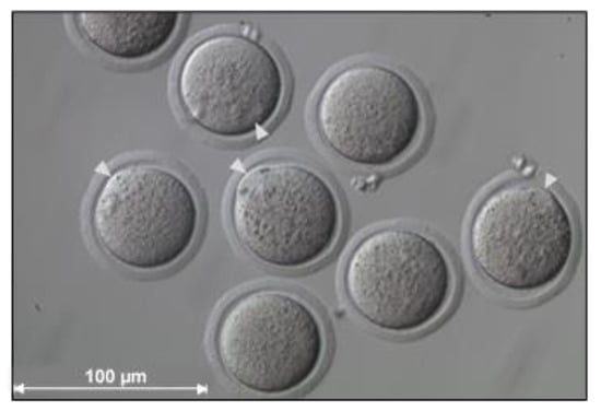 Photo image of B6D2F1 mouse oocytes. Meiotic spindle complexes (visible as a translucent region with an occasional bulge) are indicated by white arrowheads (image captured by C.G. as part of her Masters dissertation at the Reproductive Biology Laboratory, University of Pretoria).