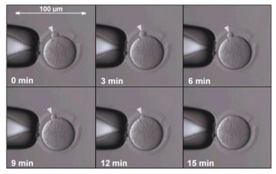 Time-lapse images showing fusion of a cumulus cell into a cytoplast within 15 min. The transferred cumulus cell is indicated by white arrowheads (images captured by C.G. as part of her Masters dissertation at the Reproductive Biology Laboratory, University of Pretoria).