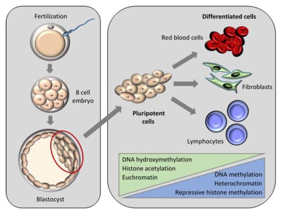 DNA compaction is achieved through interaction with histone proteins. Acetylation and methylation are generally the most extensively investigated histone modifications. Histone acetylation reduces the association between the histone and tightly packed heterochromatin, which usually results in newly accessible euchromatin which can undergo active transcription. Transcriptional activation or repression may be the result of histone methylation, depending on the histone residue altered []. In conjunction with DNA methylation, histone modifications are also changed during normal embryogenesis. Directly after fertilization in mice, the histone modification patterns of the paternal and maternal genomes are irregular. Paternal pronuclei histone H4 is hyperacetylated in comparison to that of maternal pronuclei []. In contrast, maternal pronuclei contain high levels of other histone residues which are not present in paternal pronuclei. At the blastocyst stage, deviation in the histone modification profiles of the ICM and TE are noted []. Histone modification reprogramming is more complicated than that of DNA methylation; however similar to DNA methylation, stage-specific and cell type-specific changes do occur [,].