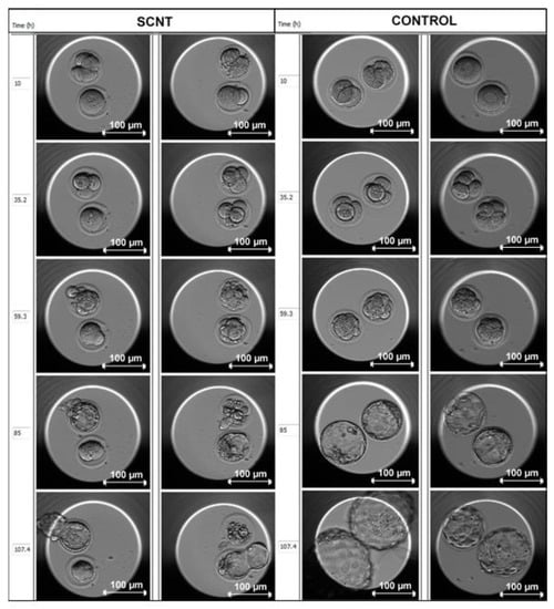 One of the main purposes of creating SCNT blastocysts is isolation of the ICM to derive ESCs. However, poor-quality SCNT blastocysts will prevent ESC isolation []. Developmental delay can be seen in the SCNT group in Figure 6 below. Essentially, the defects in the SCNT group model the defects of failing human embryos, with characteristics such as poor-quality blastocysts, delayed development, fewer cells, and genome instability. Even though the rate of blastocyst development is encouraging, protocol optimization is continuously being undertaken to focus primarily on improving SCNT embryo quality. For example, monkey and human SCNT studies, supplementing spindle enucleation and the fusion medium with caffeine, have reported improved SCNT embryo development, blastocyst quality (characterized by visible and prominent ICM formation) and subsequent ESC line derivation [,]. In a study by Mallol and colleagues, the effect of supplementing the culture medium with vitamin C for at least 16 h after activation, in combination with Latrunculin A during micromanipulation and activation, significantly increased rates of mouse blastocyst formation []. The mean number of ICM cells at 96 h post activation and the total blastocyst cell number were also increased [].