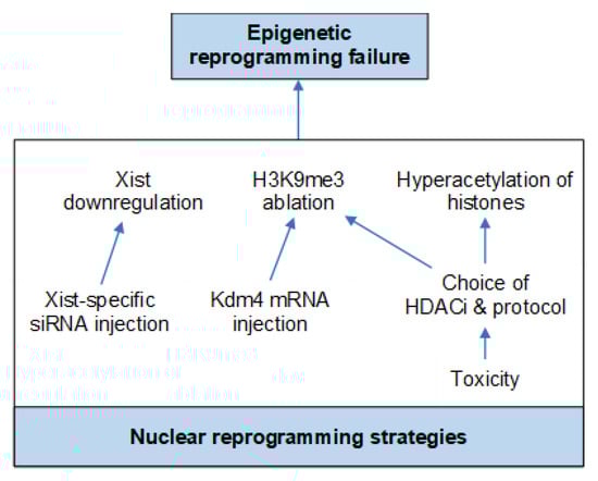 Histone deacetylase inhibitors including TSA and Scriptaid have been used successfully to improve the efficiency of SCNT blastocyst development in several species, including human, monkey, mouse, bovine and pig [,,,,,]. Nonetheless, the resulting blastocyst quality and the ability to establish stable ESCs remain unknown []. In addition, TSA toxicity [] may be detrimental to the quality of the blastocyst, and may significantly reduce normal development of the embryo [,]. Based on gene expression analysis, Inoue and colleagues discovered the downregulation of X-linked genes (required for embryonic development) in SCNT mouse embryos; this is caused by the ectopic expression of the Xist gene that is responsible for X chromosome inactivation []. Birth rate and cloning efficiency in mice were dramatically improved by complete deletion of Xist from the donor genome or repression of the gene by injecting short interfering (si) RNA into SCNT embryos [,]. Furthermore, next-generation sequencing of donor cells and SCNT embryos identified histone 3 lysine 9 trimethylation (H3K9me3) of the somatic cell genome as the main obstacle preventing nuclear reprogramming []. A significant improvement in both mouse and human SCNT cloning competence was achieved by expressing H3K9me3 demethylase lysine demethylase 4 (Kdm4) D in SCNT embryos to reduce the H3K9me3 level [,,,]. The abovementioned studies suggest that by including nuclear reprogramming strategies into the SCNT procedure, an overall improvement in cloning can be achieved.