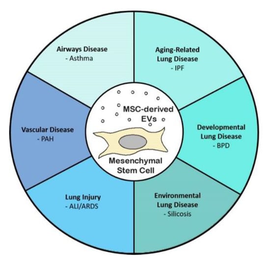 Idiopathic Pulmonary Fibrosis (IPF) is a chronic and progressive fibrosing interstitial lung disease with pathophysiology characterized by fibroblast proliferation and extracellular matrix remodeling []. IPF has multiple genetic associations but no clearly defined cause and few effective treatments. Pirfenidone and nintedanib are the only currently United States Food and Drug Administration (FDA)-approved options for treatment, but they do not significantly ameliorate respiratory symptoms, improve the rate of acute exacerbations, or prevent the eventual decline of lung function [,,,]. Stem cell therapy has been used as a treatment for pulmonary fibrosis in pre-clinical animal models and in human patients with IPF. In animal models, these studies have demonstrated that adult stem cells can help to prevent the progression of pulmonary fibrosis in the bleomycin-induced pulmonary fibrosis model [,]. In human studies, MSC-based therapy has been shown to be safe and well-tolerated and improved quality-of-life parameters in phase 1 clinical trials [,,]. As with other pulmonary diseases, there is now increasing interest in using the EVs released from mesenchymal stem cells for IPF therapies.