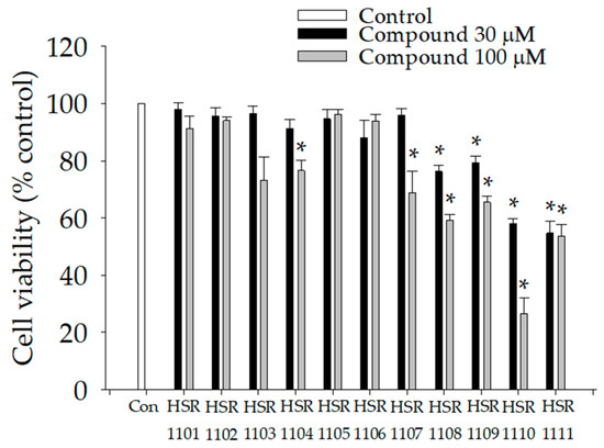 Prior to the evaluation of their anti-inflammatory and anti-migratory activities, we first examined the effects of isoquinoline-1-carboxamide derivatives on BV2 cell viabilities. The cells were treated with the tested compounds at the concentrations of 30 or 100 µM for 24 h, and then MTT assays were performed. We found that the derivatives with N-hydroxyphenyl (HSR1101~1103) and N-methoxyphenyl (HSR1105 and 1106) substituents revealed no significant cytotoxicity at the concentrations examined in this study (Figure 2). In contrast, the derivatives with N-(trifluoromethyl)phenyl (HSR1108 and 1109), N-bis(trifluoromethyl)phenyl (HSR1110) or N-chlorophenyl (HSR1111) substituents showed prominent cytotoxicity at both 30 and 100 µM concentrations. Although the derivatives with N-methoxyphenyl (HSR1104) and N-(trifluoromethyl)phenyl (HSR1107) substituents did not exhibit any noticeable cytotoxicity at 30 µM, considerable cytotoxicity was observed at the concentration of 100 µM. Based on these findings, five compounds (HSR1101~1103, 1105, and 1106) without showing significant cytotoxicity up to 100 µM were selected for further investigations.