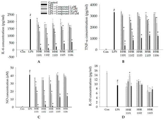 Effects of HSR1101~1103, 1105, and 1106 on pro- and anti-inflammatory mediators in lipopolysaccharide (LPS)-treated BV2 cells. BV2 cells were co-treated with 1 μg/mL LPS and a series of concentrations of tested compounds for 24 h. Culture media were then analyzed for interleukin (IL)-6 (A), TNF-α (B), NO (C), and IL-10 (D) levels, as described in the Materials and methods section. Data are expressed as mean ± SEM of at least three independent experiments. # p < 0.05 and * p < 0.05 vs the vehicle-treated control and LPS-treated groups, respectively. Con, control; LPS, lipopolysaccharide; IL, interleukin; TNF-α, tumor necrosis factor-alpha; NO, nitric oxide.