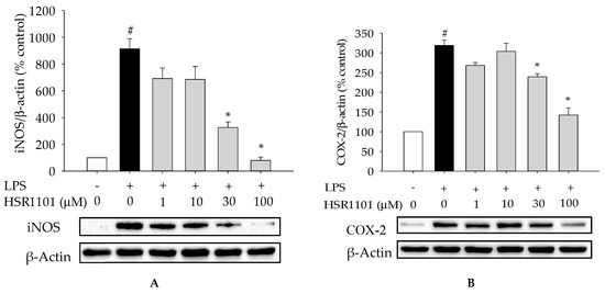 HSR1101 inhibited LPS-induced expression of inducible NO synthase (iNOS) and COX-2 in BV2 cells. BV2 cells were co-treated with 1 μg/mL LPS and a series of concentrations of HSR1101 for 24 h. Western blotting analyses were conducted using anti-iNOS (A) and anti-COX-2 (B) antibodies, as described in the Materials and methods section. β-Actin was used for normalizing iNOS and COX-2. Representative blots are displayed. Data are expressed as mean ± SEM of at least three independent experiments. # p < 0.05 and * p < 0.05 vs the vehicle-treated control and LPS-treated groups, respectively. LPS, lipopolysaccharide; iNOS, inducible nitric oxide synthase; COX-2, cyclooxygenase-2.