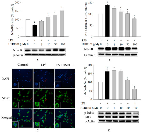HSR1101 inhibited LPS-induced nuclear translocation of NF-κB through suppression of IκBα phosphorylation in BV2 cells. BV2 cells were co-treated with 1 μg/mL LPS and a series of concentrations of HSR1101 for 24 h. Western blotting analyses for cytosolic (A) and nuclear (B) extracts were conducted using anti-NF-κB p65 subunit antibody. β-Actin and lamin B1 were used for normalizing cytosolic and nuclear NF-κB, respectively. Immunofluorescence images show inhibition of NF-κB translocation by HSR1101 (C). The red arrows indicate the magnified cells shown in each image. Scale bar, 50 μm. Western blotting analyses were conducted using anti-phospho-IκBα and anti-IκBα antibodies (D). β-Actin was used for normalizing phosphor-IκBα. Representative blots are displayed. Data are expressed as mean ± SEM of at least three independent experiments. # p < 0.05 and * p < 0.05 vs the vehicle-treated control and LPS-treated groups, respectively. LPS, lipopolysaccharide; NF-κB, nuclear factor-kappa B; IκBα, inhibitor of kappa B alpha.