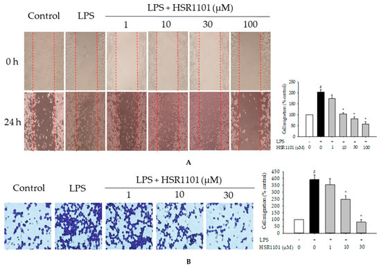 HSR1101 inhibited LPS-induced migration of BV2 cells. BV2 cells were co-treated with 1 μg/mL LPS and a series of concentrations of HSR1101 for 24 h and then analyzed for differences in migration of cells by wound healing (A) and transwell migration assays (B), as described in the Materials and Methods section. Data are expressed as mean ± SEM of at least three independent experiments. # p < 0.05 and * p < 0.05 vs the vehicle-treated control and LPS-treated groups, respectively. LPS, lipopolysaccharide.