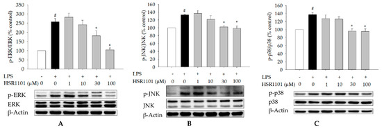 The MAPK family, which includes ERK1/2, JNK, and p38 MAPK, is thought to play pivotal roles in modulating pro-inflammatory mediators and cell migration in various cell types including microglial cells [20,21,22,23,26,27]. Therefore, we aimed to evaluate whether MAPK pathways were associated with anti-inflammatory and anti-migratory activities of HSR1101 in BV2 cells. It was revealed that treatment with LPS significantly increased the phosphorylation of ERK1/2, JNK and p38 MAPK and HSR1101 abated the LPS-induced phosphorylation of MAPKs (Figure 7).