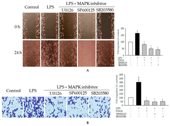 Specific MAPK inhibitors inhibited cell migration in BV2 cells. BV2 cells were co-treated with 1 μg/mL LPS and 10 μM of the specific MAPK inhibitors (U0126, SP600125, and SB203580) for 24 h, and cell migration was evaluated by wound healing (A) and transwell migration assays (B), as described in the Materials and methods section. Differences in BV2 cell migration were determined using ImageJ version 1.49 software. Data are expressed as mean ± SEM of at least three independent experiments. # p < 0.05 and * p < 0.05 vs the vehicle-treated control and LPS-treated groups, respectively. LPS, lipopolysaccharide; MAPK, mitogen-activated protein kinase.