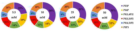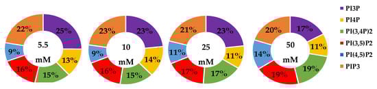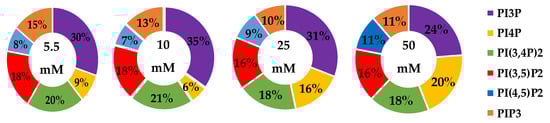 The whole cell lipidome percentage of each PI phosphorylation category in the MCF7 cell line across increasing glucose serum concentrations were obtained from the spot blots and summarized pictorially in Figure 2, while the average percentage of total lipid, standard deviation, and fold changes are presented in Table 2. The largest component of this profile was PI3P followed by PI(3,4)P2 and PI(3,5)P2 regardless of the serum glucose concentration. As predicted, the PI(4,5)P2 and PIP3 were the smallest components of the profile regardless of the serum glucose concentration. There were no statistically significant changes (p < 0.05) in the PI3P, di-phosphorylated, and PIP3 relative concentrations as a function of glucose serum concentration. There was also a statistically significant two-fold increase in the percentage of PI4P between 5.5 mM and 50 mM glucose serum concentrations (p < 0.05). In summary, these results suggest that hyperglycemia causes an overall depression of 4′-phosphatase activity in hormone responsive breast cancers.