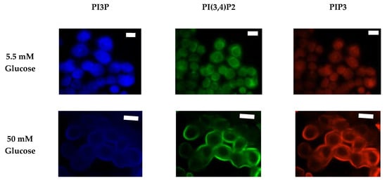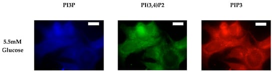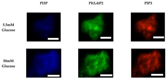 Cells were rinsed twice with phosphate buffered saline solution (PBS). The cells were then fixed on the cover slips with 4% PFA in PBS, washed 3 times with PBS, permeabilized by 0.5% saponin, and again washed with tris buffered saline (TBS). The cells were blocked with 10% goat serum in TBS at 4 °C overnight followed by incubated for 1 hr at 37 °C with antibodies previously conjugated to Alexa Fluor 350, Alexa Fluor 488, and Alexa Fluor 594 (1:40,000 dilution) and washed 3 times with TBS []. The cells were rinsed thoroughly with diH2O, dried completely, and sealed with mounting media to slides. Imaging was done using Zeiss Axiovision (v. 48) on a Zeiss Axio Observer Z1 confocal microscope (Carl Zeiss Microscopy, Jena, Germany) using a 60× oil objective [,,] where each cell line had consistent exposure times across the biological triplicates. PI3P, PI(3,4)P2, and PIP3 was observed using the 4′,6-diamidino-2-phenylindole (DAPI), green fluorescent protein, and Texas Red filter sets, respectively. Quantification of the fixed cell fluorescence intensity was performed through ImageJ v2.0.0 (National Institute of Mental Health, Bethesda, MD, USA). Fluorescence intensity measurements were obtained by recording the Integrated Density, which was used to determine the percentage of the total fluorescence between the three components. The analysis was performed using biological triplicates with n > 20 cells in each replicate.
