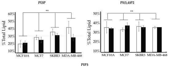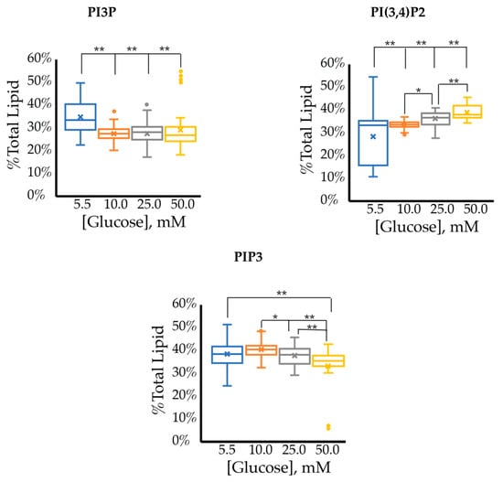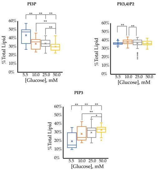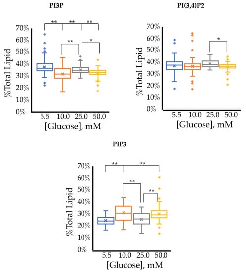 Effect of glucose concentration on PI3P, PI(3,4)P2, and PIP3 concentration across MDA-MB-468 cell line (fluorescence intensity in fixed cells, n > 60). The % of total PI lipid for each mono-, di-, and tri-phosphorylated PI was determined through intensity analysis for the MDA-MB-468 cell line, incubated at 5.5 (☐), 10 (☐), 25 (☐), and 50 (☐) mM serum glucose concentrations, respectively. * denotes p < 0.05 and ** denotes p < 0.005 as determined by a one-way ANOVA pair-wise comparison.