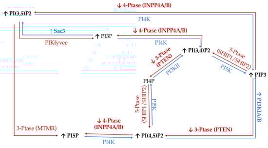 Triple Negative Breast Cancer (TNBC) related expression of PI kinases and phosphatases. Graphical representation of the cancer specific overexpression/increased activity (↑) and decreased expression/activity (↓) of the kinases (blue), phosphatases (red), as well as the hypothesized effects on the resulting lipidome have been noted.