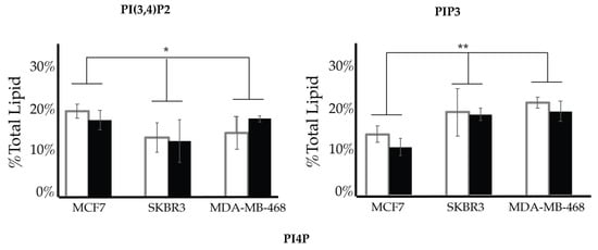 To study the effect of hyperglycemia on HER2+ breast cancer, we utilized the metastatic SKBR3 cell line. The literature has identified HER2+ subtype specific aberrancies in PI phosphatases and kinases; namely PI3K Class I and PI4K [,]. Furthermore, the literature reports that cancer-associated mutations in the catalytic domain of PI3K increases the activity in HER2+ breast cancer [,]. This trend suggests an increase in PIP3 accumulation generated from PI(4,5)P2. Additionally, HER2+ breast cancer samples generally overexpress both PIP4K2B and PIP4K2A [,]. The overexpression of PI4K, therefore, suggests that there will be an increase in PI(4,5)P2 accumulation, generated from PI5P. This change may also lead to a decrease in PI(3,5)P2 as it is also converted into PIP3. Currently, there has been no report of changes in activity levels for the either the 3′ or 4′-phosphatases nor 5′-kinases/phosphatases. Therefore, we expect to see little to no change in the abundance of the mono and di-phosphorylated PI species. While there is little to inform predictions on the mono-phosphorylated PI lipids, action taken by PI3K and PI4K will act to both reduce and increase the relative pool of PI(4,5)P2, respectively, thus leading to no net change of this PIP2. In summary, HER2+ breast cancer should have an increased accumulation of PI(3,4)P2 and PIP3, while decreasing the overall PI(3,5)P2 content (Figure 5).