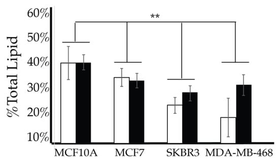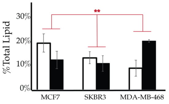 Finally, hyperglycemia in TNBC in led to a decisive increase in PIP3 due to phosphorylation of PI3P and the associated di-phosphorylated PIs. As discussed within the context of HER2+ breast cancer, hyperglycemic related increases in PIP3 leads to overall dysregulation of the cellular polarity causing extensions suggestive of transition to a more mesenchymal cell type. This would be further exasperated with the loss of the PI3P, which is known to lead to a loss of apical membrane proteins localized within the plasma membrane. While T2D has been linked to the onset and aggressiveness of the other breast cancers in this study, T2D premenopausal breast cancer patients are more often diagnosed with hormone receptor negative, HER2-negative, TNBC []. TNBC also presents more frequently in women of African descent or with BRCA mutations generally found in women of Ashkenazi Jewish descent [,,,,]. TNBCs are generally seen as being more aggressive, have fewer treatment options, and present as higher grades than the other types. This work was done with MDA-MB-468 cells, which originate from the metastasis site in the pleural effusion of a black woman. Thus suggesting the lipidomic results in this report provide insight as to the cellular mechanisms that lead to T2D related TNBC aggression. However, future studies would also compare these results with those generated from a Caucasian originated sample to define the role in racial disparities in this breast cancer type.