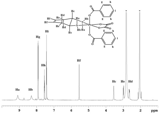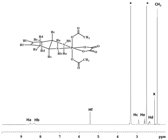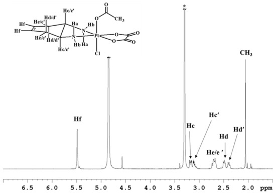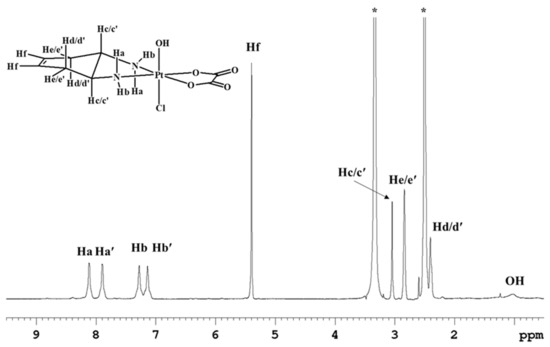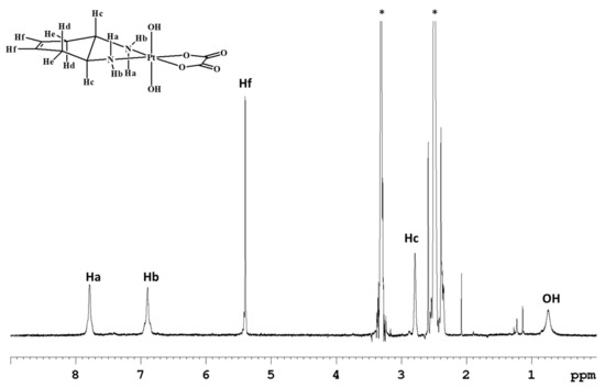 The 1H-NMR spectrum in deuterated dimethylsulfoxide (DMSO-d6) of complex 1 (Figure 1) shows two singlets, at 7.79 and 6.91 ppm, assigned to the amino protons in pseudo-axial (Ha) and pseudo-equatorial (Hb) positions, respectively (Table 1). The amino protons resonate at lower fields than the corresponding protons in the Pt(II) precursor [Pt(OXA)(DACHEX)] (6.27 and 5.49 ppm); the deshielding is a consequence of the change in the oxidation state of platinum. The 5.4 ppm singlet (integrating for two protons) was assigned to the vinylic protons (Hf), while the signal at 2.80 ppm, integrating for two protons, was assigned to the methynic protons (Hc). From the NMR spectrum in DMSO-d6, it was not possible to assign the methylene protons He and Hd due to overlap with the solvent signal. Finally, the broad signal at 0.74 ppm was assigned to the hydroxyl groups present in the axial positions.